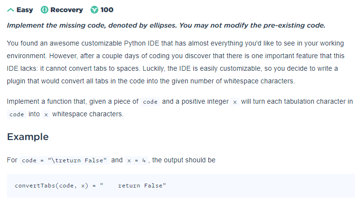 이 문제 또한 예시를 보면 이해가 됩니다. "\t"라는 부분이 발견되면 x 의 값 만큼 탭크기를 설정해서 띄어달라는 것입니다. 말로는 쉽지만 이것을 한 줄의 코드로 완성하라는 것입니다. (순간 난이도 극혐)