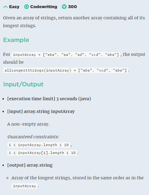 문제에서는 주어진 문자열 배열에서 각 요소별로 보았을때, 가장 긴 문자열을 따로 뽑아서 배열로 만들어 리턴해주라는 겁니다. 일단 간단하죠 ...?